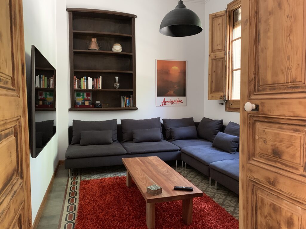 La nostra sala de TV té capacitat per 8 persones en un sofà ben còmode i una pantalla de 65″.